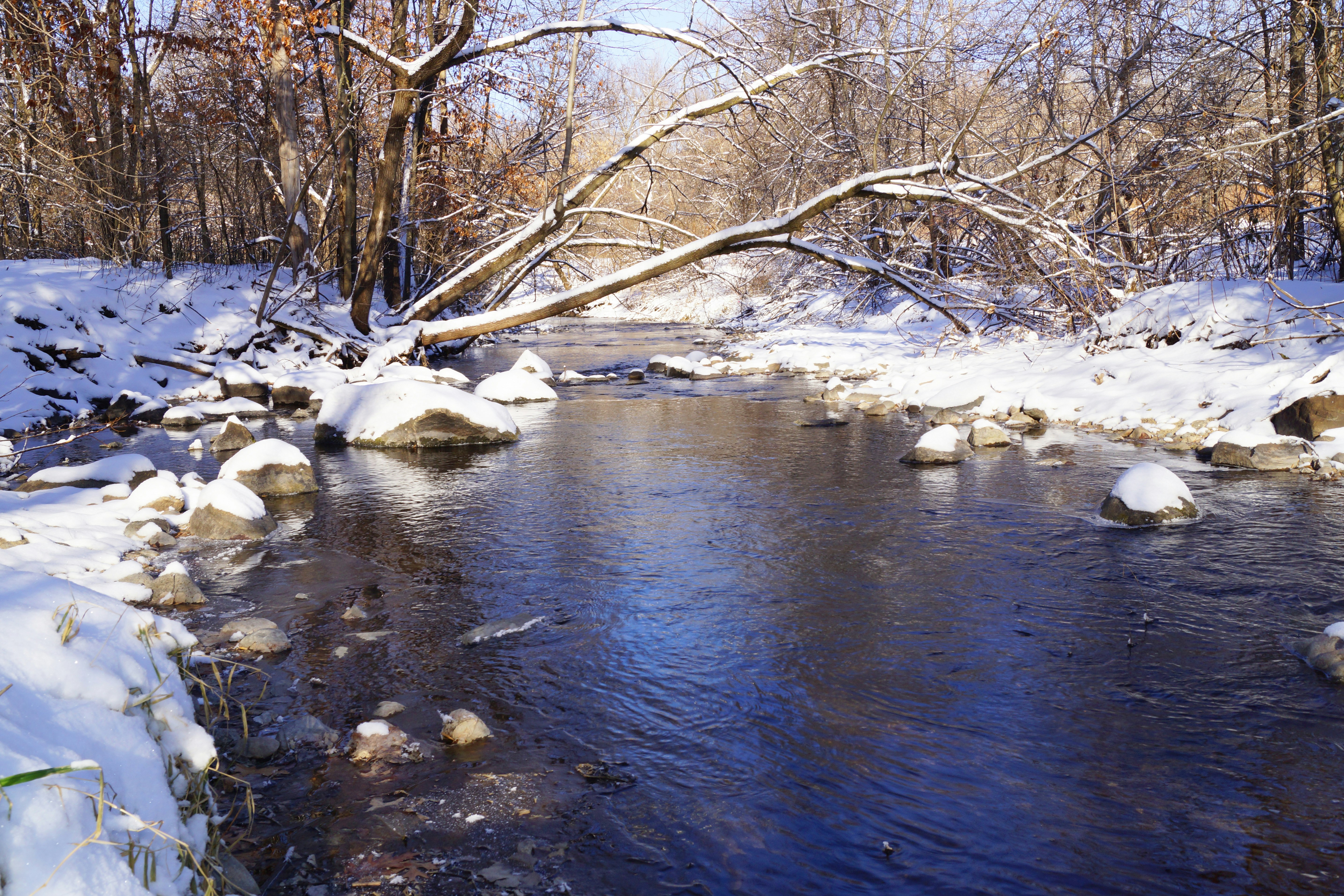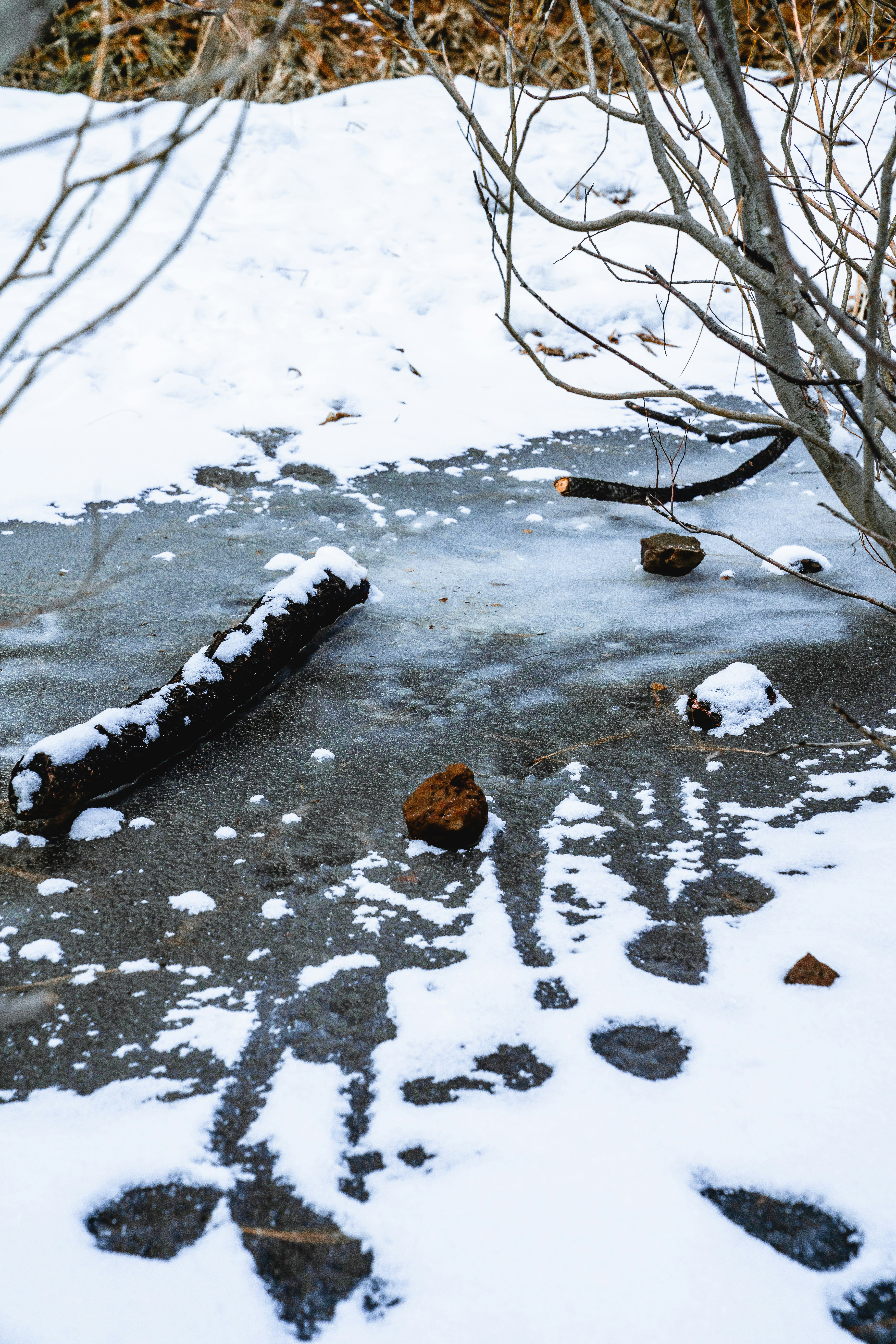Intense seconds of swishing past the river rock iced over, thickets